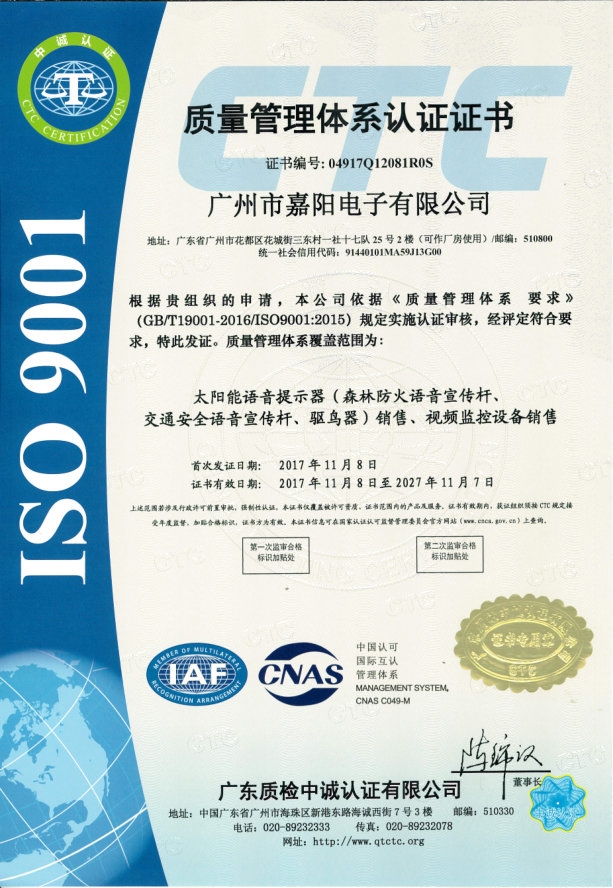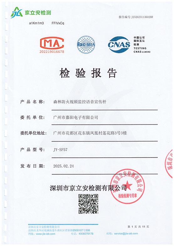 广州市嘉阳电子有限公司成立于 2017 年,是一家专注于视频监控以及语音宣传的物联应用,致力于电子技术研发、生产和销售的高科技企业。公司主要涵盖了森林防火、智慧交通和水利等领域,公司秉承着“创新、品质、服务、共赢”的核心价值观凭借先进的技术、严格的生产质量和卓越的客户服务推动行业发展,荣获国家“高新技术企业 ”称号 。嘉阳电子有限公司的产品远销全国多个地区,始终坚持以客户需求为导向,提供定制化解决方案,赢得了广泛的市场认可和行业好评。